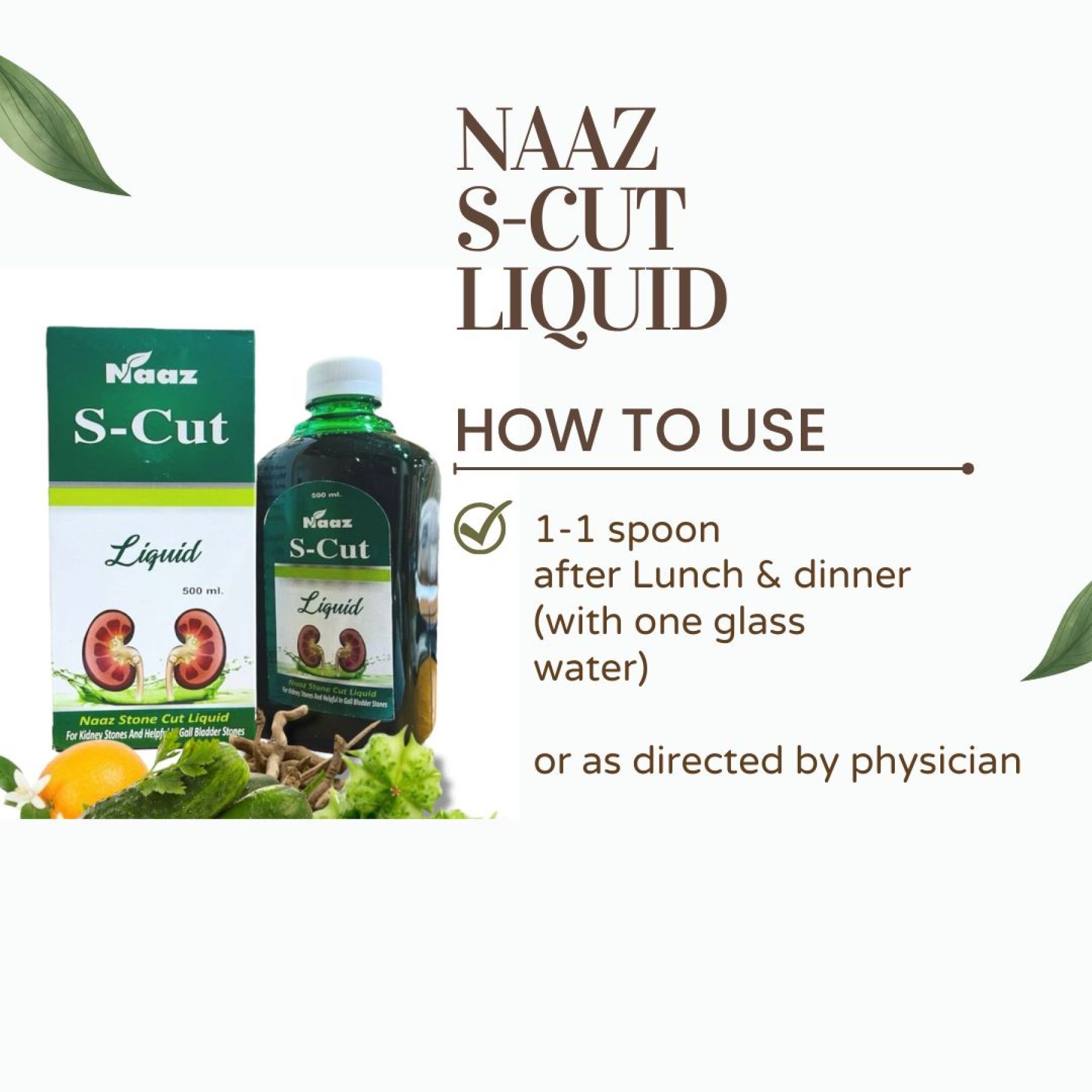 After lunch and dinner, take one glass of water. Add one teaspoon of eating soda, half a lemon (juice), and one teaspoon (5 ml) of Stonecut Liquid. Stir well and consume. Use regularly or as directed by your physician for best results.